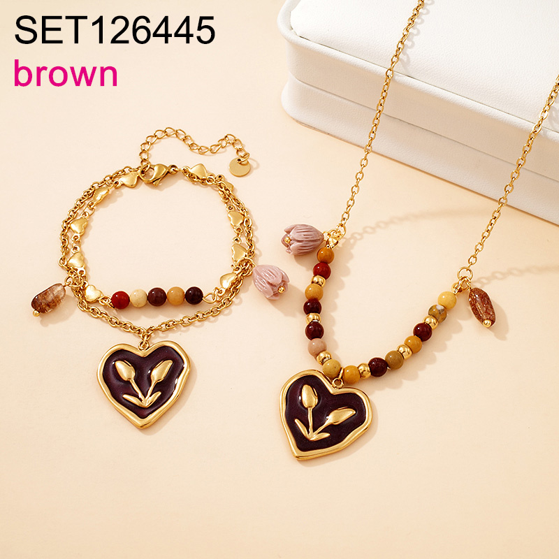 Level B Stainless Steel New Trendy Women Jewelry Drip Oil/Enamel Brown Heart Golden Chain SET