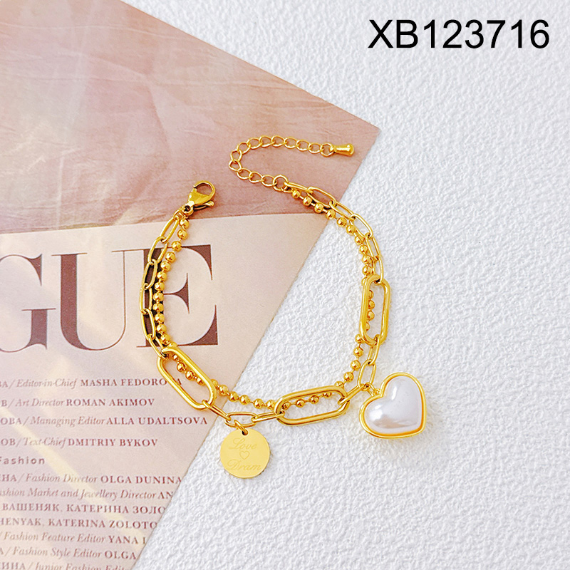 Level B Stainless Steel New Trendy Women Jewelry Pearl Style/Plastic Beads Two Layers Chain Heart Golden Bracelet
