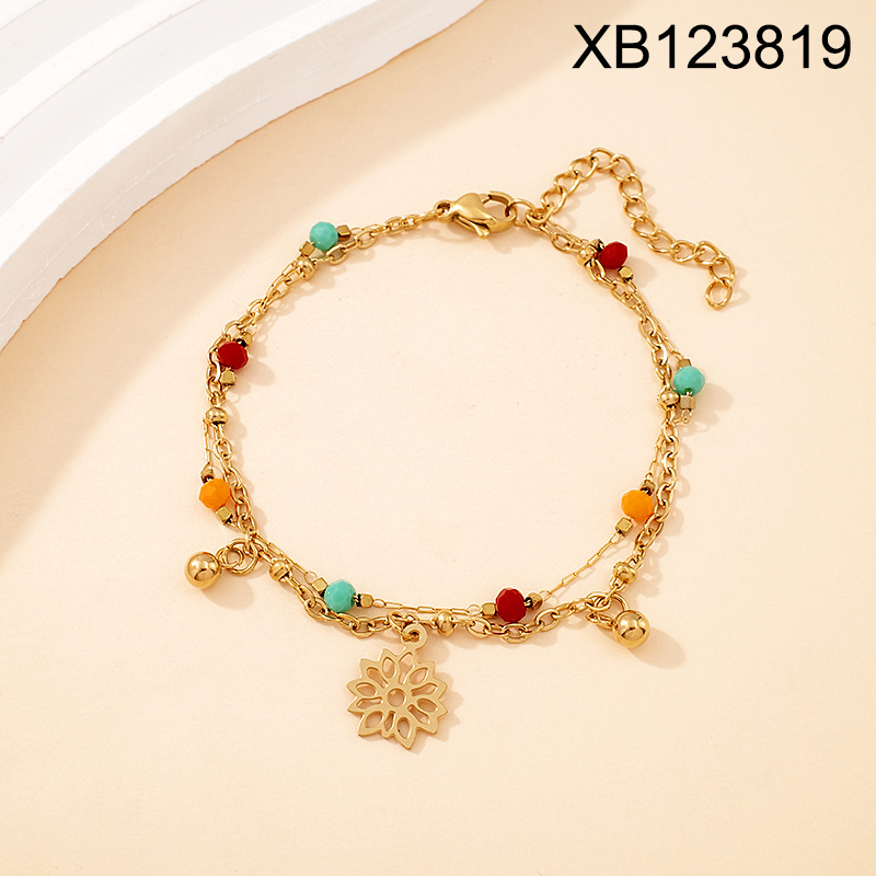 Level B Stainless Steel New Trendy Women Jewelry Two Layers Chain Flower Golden Bracelet