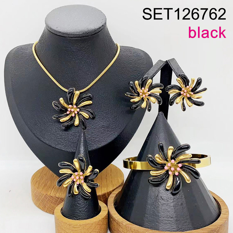 Level B Stainless Steel New Trendy Women Jewelry Drip Oil/Enamel Black Flower Golden 4pcs SET