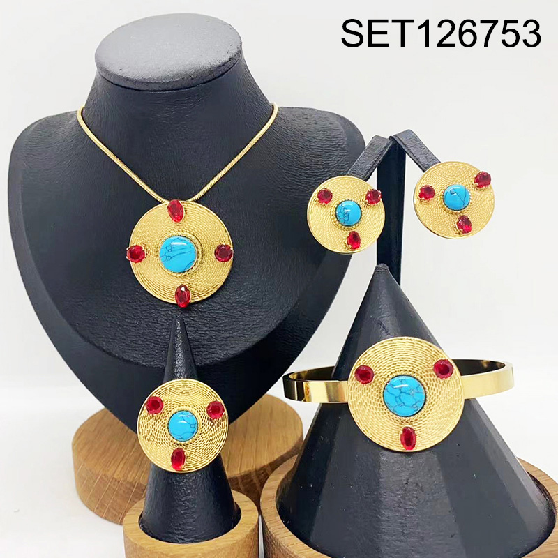 Home > Level B Stainless Steel New Trendy Women Jewelry Blue Turquoise Beads Round Golden 4pcs SET