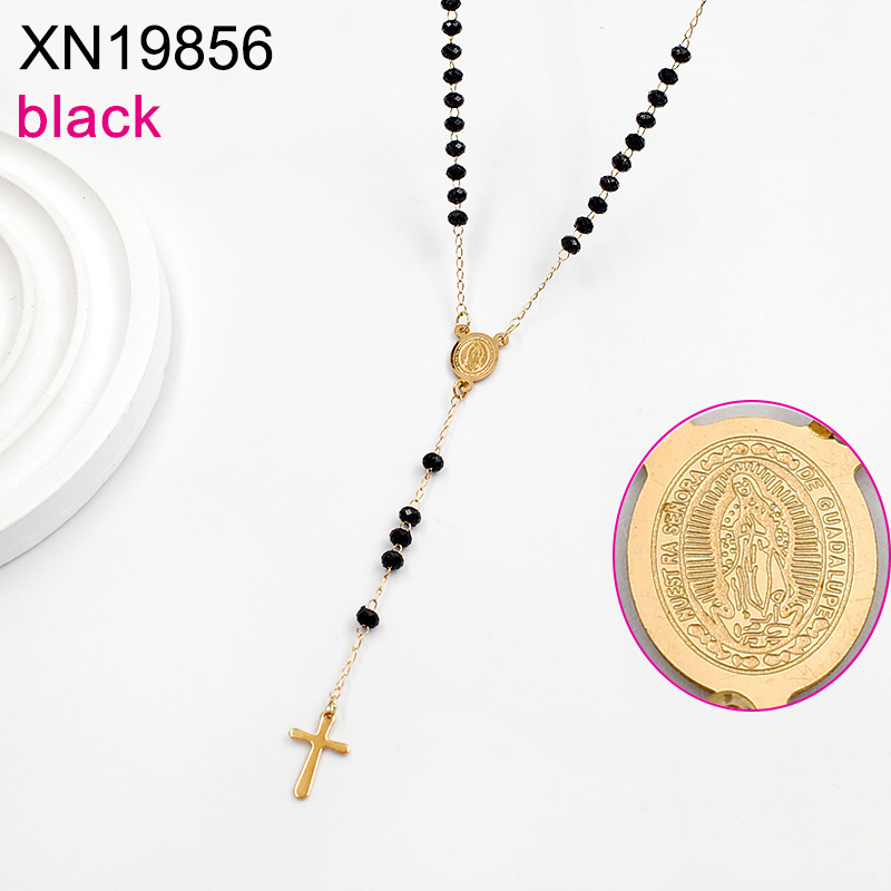 Level B Stainless Steel New Trendy Women Jewelry Black Bead Chain Religion Cross Golden Necklace