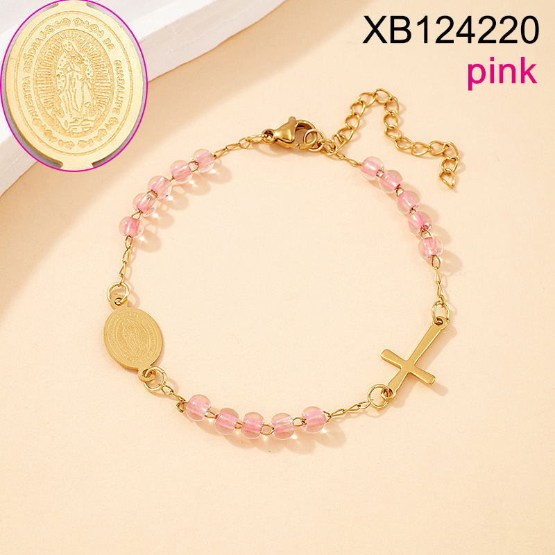 Level B Stainless Steel New Trendy Women Jewelry Pink Bead Chain Religion Cross Golden Bracelet