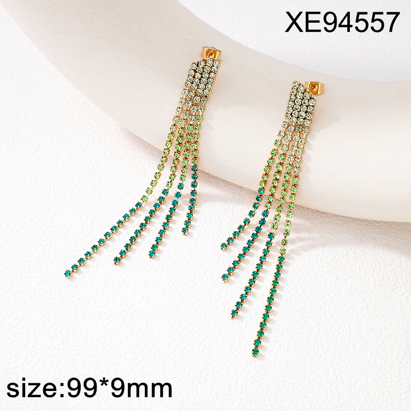 Home > Level B Stainless Steel New Trendy Women Jewelry Rhinestone Golden Gradient Green Tennis Chain Four Rows Tassel Earrings