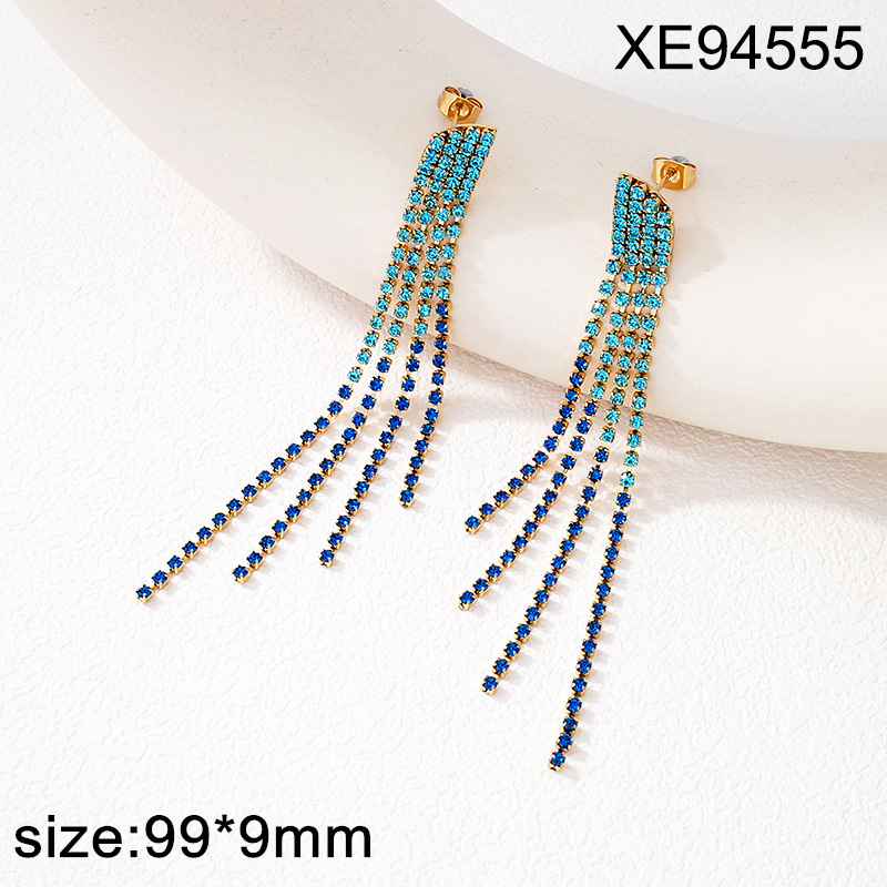 Home > Level B Stainless Steel New Trendy Women Jewelry Rhinestone Golden Gradient Blue Tennis Chain Four Rows Tassel Earrings
