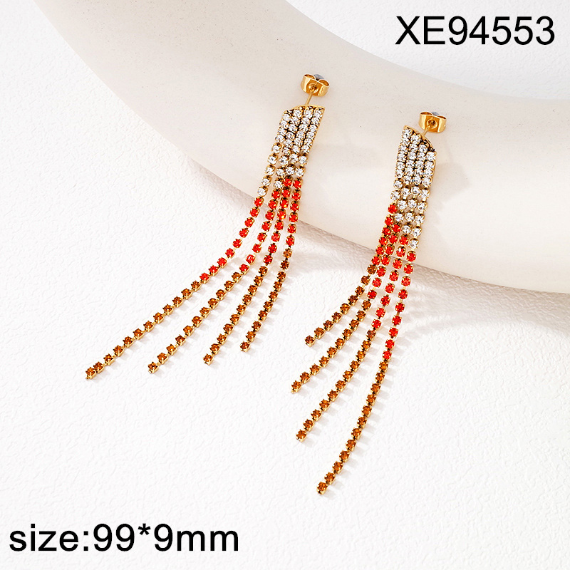 Home > Level B Stainless Steel New Trendy Women Jewelry Rhinestone Golden Gradient Red Tennis Chain Four Rows Tassel Earrings